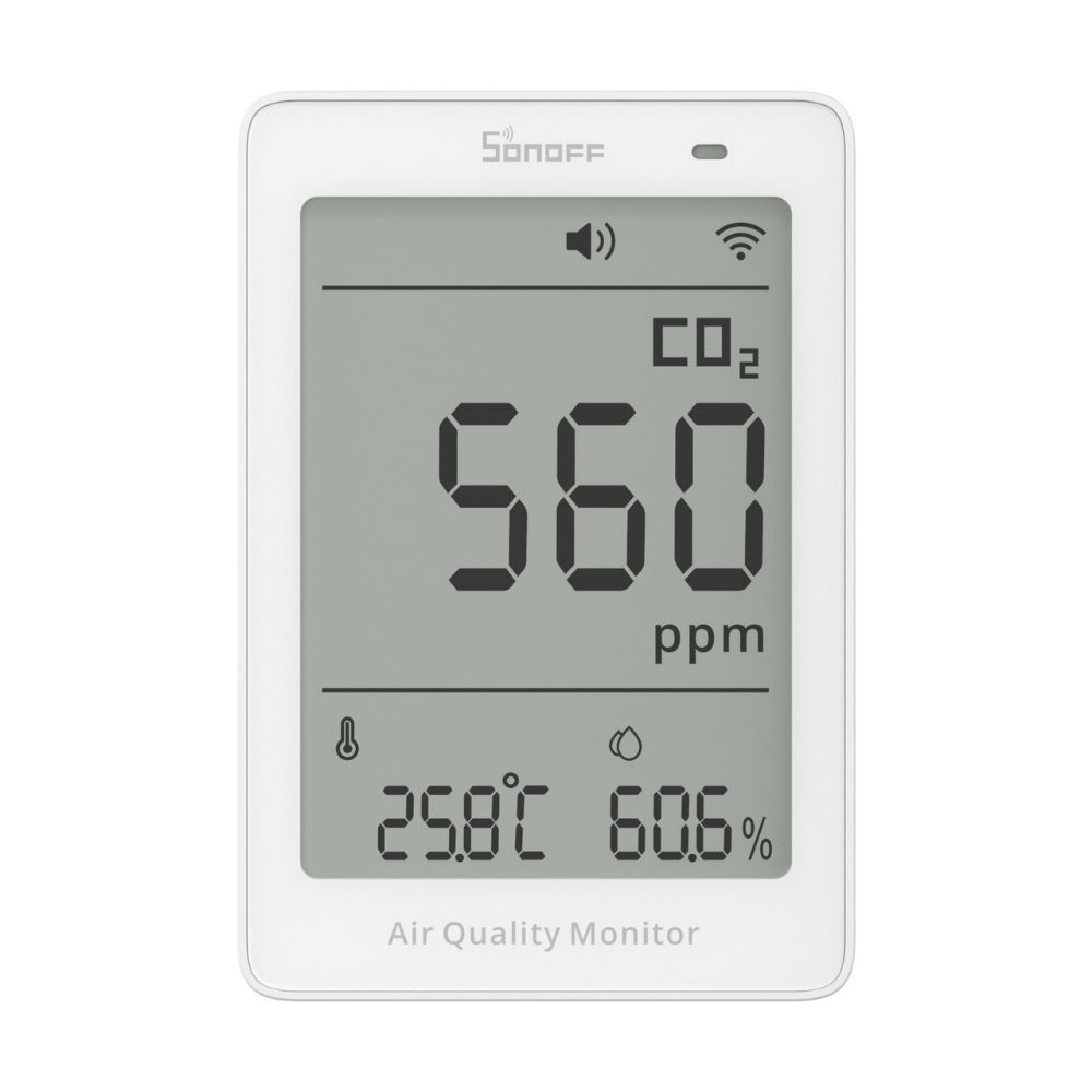 The SONOFF AirGuard CO₂ (SAWF-08P) is a Matter over Wi-Fi-enabled air quality monitor with NDIR-based CO₂ sensing technology, capable of measuring and displaying real-time carbon dioxide levels, temperature, and humidity.